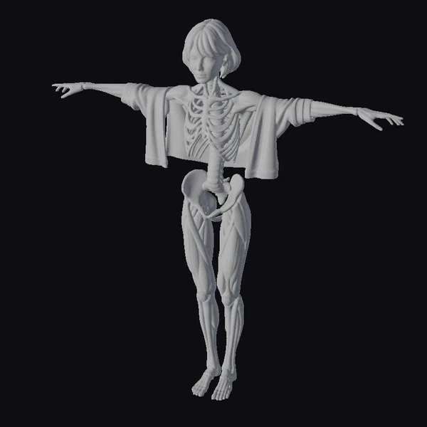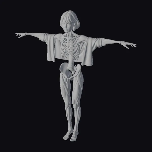 Standing with arms outstretched, this anatomically precise 3D model of a woman reveals the intricate details of her skeletal and muscular systems. Her short black hair frames her serene expression, while her white shirt appears to be slipping off her shoulders, adding a sense of dynamic movement. The model’s pose and detailed textures make it an invaluable resource for medical professionals, educators, and artists seeking to explore the human form. Its applications span educational materials, medical simulations, and high-fidelity animations.