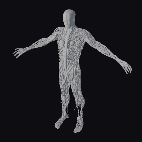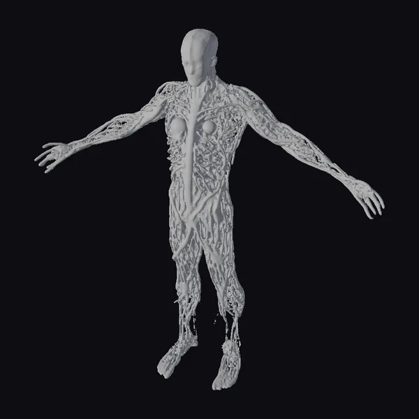 Standing tall with arms outstretched, this anatomical human body model presents a detailed visual representation of the human body’s inner workings. The model’s skin appears translucent, revealing a complex network of veins, arteries, and muscles that are meticulously rendered to provide a clear understanding of human anatomy. The red blood vessels pop against the more subdued tones of the body’s tissues, drawing the viewer’s eye to the circulatory system’s key components. The model’s pose, with arms outstretched and feet shoulder-width apart, suggests a sense of openness and accessibility, making it an ideal tool for educational purposes in fields such as medicine, anatomy, and biology. Whether for 3D printing, animation, or virtual reality applications, this model is poised to enhance any project requiring a detailed, accurate representation of the human body.