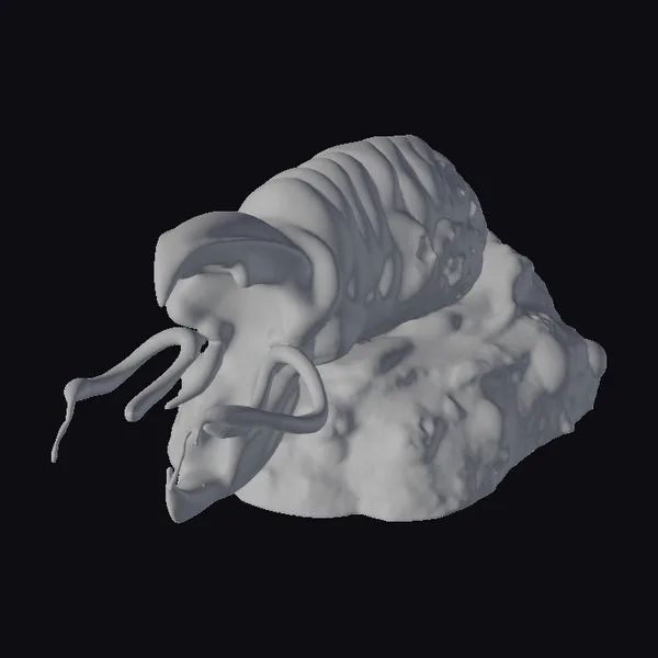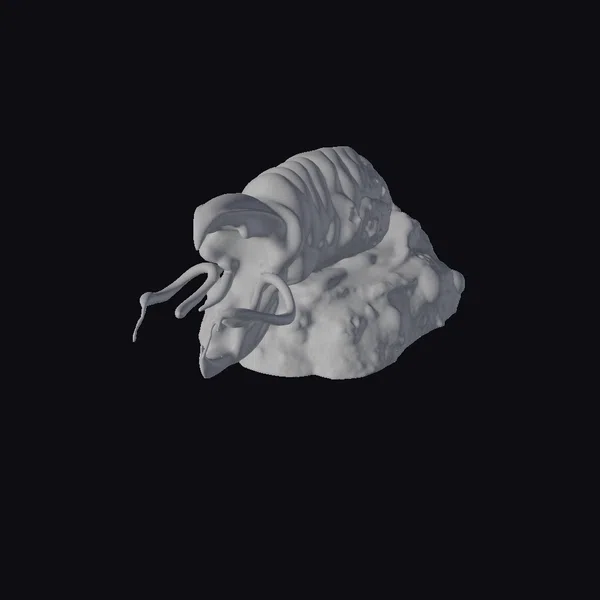 This intricately detailed sculpture showcases an alien creature in a state of repose, resting on a textured stone base that mirrors the naturalistic tones of its body. The creature’s form is characterized by a series of connected, rib-like plates that cover its back, while its face features several long, thin tentacle-like structures that suggest a highly specialized sensory apparatus. The entire piece exudes a sense of age and mystique, as if unearthed from a long-forgotten era. The model is highly detailed, with a focus on realistic textures and anatomy, making it suitable for use in various applications such as game development, animation, virtual reality, and 3D printing.