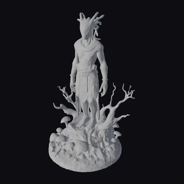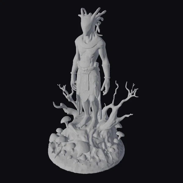 Standing tall on a base of twisted tree roots and vibrant green moss, this ancient alien warrior exudes an aura of mystique and power. The statue’s metallic body, with its green patina, showcases detailed anatomy, from the defined muscles across its chest to the intricate designs on its arms and waist. The alien’s face, hidden behind a mask-like feature with antennae-like protrusions, adds to its enigmatic presence. The base, teeming with life in the form of glowing mushrooms, contrasts sharply with the barren, dead tree roots, creating a compelling narrative of life and death. This model is perfect for use in games, 3D printing, VR/AR experiences, animation, and design projects, offering a rich, detailed element that invites imagination and storytelling.