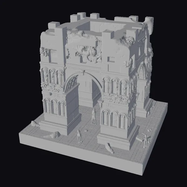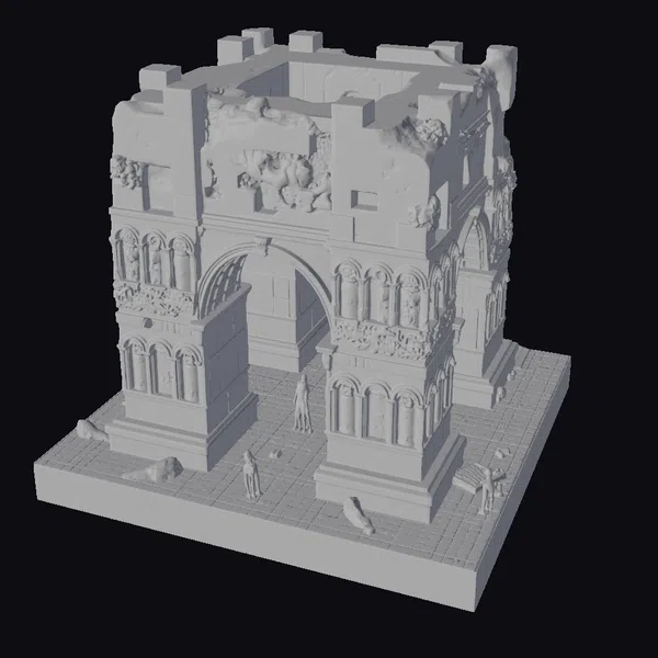 Perched on a worn stone base, the ancient arch ruins model presents a detailed, crumbling facade. The once-majestic structure now lies in disarray, with chunks missing from its walls and ornate details worn smooth by the elements. A grand archway stands at its center, flanked by intricately carved stone columns. The model’s textures evoke a sense of aged stone, with subtle weathering and decay adding depth to its appearance. Ideal for use in games, 3D printing, VR/AR experiences, animation, and architectural design projects, this model brings an air of history and mystery to any scene.