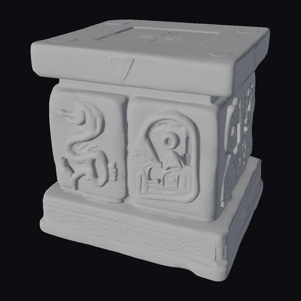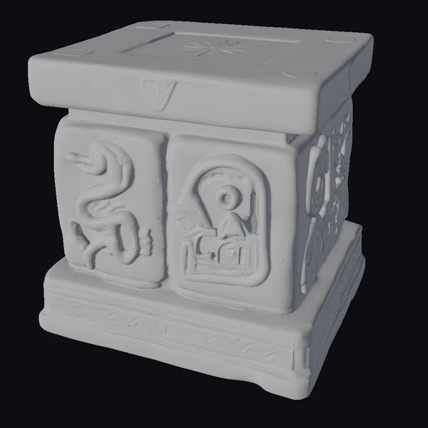 Perched on a stepped base, this ancient artifact box boasts a sturdy, square design with a flat top, adorned with a radiant gold sunburst pattern. The gray stone, with its subtle cracks and texture, contrasts beautifully with the shiny gold embellishments. Each side of the box showcases unique carvings: a serpent on one side, an arched figure on another, and an intricate design on the third. The gold accents add a touch of luxury, suggesting a relic of great importance. The box’s ornate details and weathered appearance make it a perfect addition to any setting, whether for historical or fantasy-themed projects. Ideal for use in games, 3D printing, VR/AR experiences, animation, or design projects.