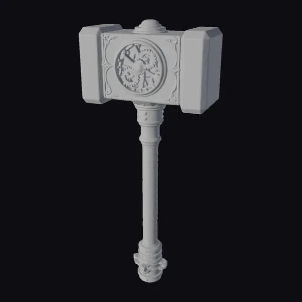 Standing tall with its imposing gray metallic head, this ancient battle hammer is a marvel of mythical craftsmanship. The head, square in shape with slightly rounded edges, features a stunning golden circular design at its center, surrounded by ornate patterns that dance across its surface. A sturdy handle, wrapped in a textured material, connects seamlessly to the hammerhead, reinforced with golden bands that add to its majestic appearance. The model’s attention to detail, from the subtle shading on the metal to the precision of the engravings, makes it a prime choice for projects demanding authenticity and fantasy flair. Ideal for use in game development, animation projects, or as a striking 3D print, this hammer promises to bring a touch of legend to any scene.