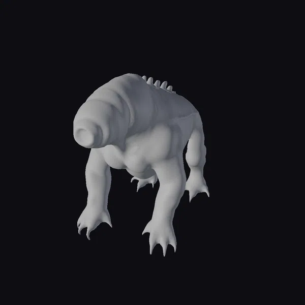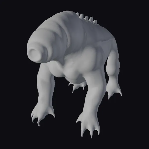 The creature’s body is a mass of muscular, scaly flesh, with a distinctive row of spines running down its back. Its large, round eye seems to bulge from its head, giving it an unsettling appearance. The creature’s limbs are thick and powerful, ending in sharp, claw-like nails. The texture of its skin is rough and bumpy, with a subtle sheen that suggests a damp, slimy surface. This creature would be perfect for adding a touch of horror or fantasy to any 3D project, from animations and games to architectural visualizations and concept art.