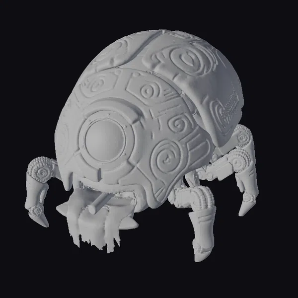 The Ancient Beetle Medical Dispenser presents itself in a dynamic pose, showcasing its detailed, bone-white shell adorned with tribal healing patterns that spiral and intersect across its surface. A large, glowing green eye serves as the focal point on its ‘head’, while a mechanical, purple and orange tongue extends from its mouth, suggesting the dispensing of medicine. The dispenser’s body is supported by six mechanical legs, each tipped with sharp, claw-like protrusions. The contrast between the organic, beetle-like shell and the metallic, mechanical components creates a captivating visual effect. This model is perfect for projects requiring a blend of fantasy and science fiction elements, such as game development, animation, virtual reality experiences, or architectural visualizations. Its unique design ensures it stands out in any scene, adding a touch of mystique and advanced technology.