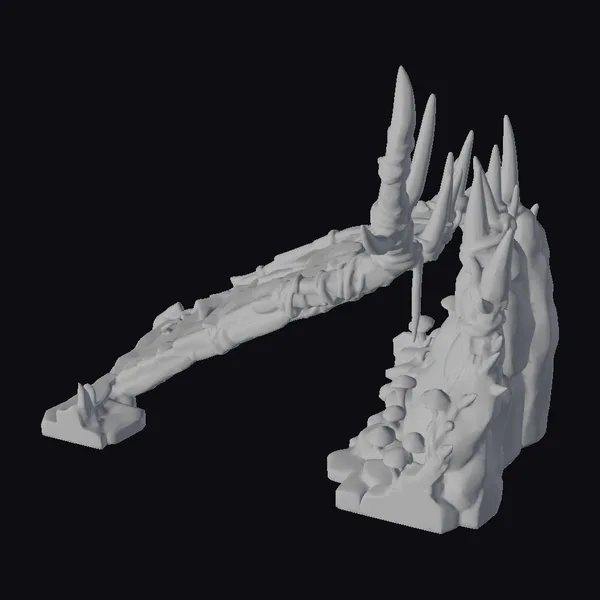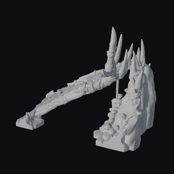 Perched precariously, this ancient bridge stretches across, its foundation composed of aged, spiked animal bones that seem to have been fused together by time and the elements. The bioluminescent rope that weaves through its structure pulsates with a soft, ethereal light, casting an eerie glow on the surroundings. The bridge’s steps, made from the same weathered bone, lead up to a platform that appears both foreboding and fascinating. Ideal for adding a touch of dark fantasy to games, print projects, VR/AR experiences, animations, or architectural designs, this model brings a unique blend of horror and mystique.