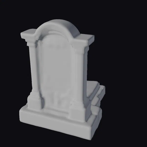 Positioned at a slight angle, this ancient stone tombstone features a detailed, arched top adorned with a sunburst motif and flanked by two columns. The stone surface is predominantly gray, with patches of green moss adding a touch of nature’s reclaiming power. The base and surrounding steps are similarly weathered, with dirt and moss covering the crevices. The tombstone’s front bears an inscription, though the text appears to be in a forgotten language, adding to the enigmatic aura. This model is perfect for use in games, 3D printing, VR/AR experiences, animation, and design projects where a touch of aged mystique is desired.
