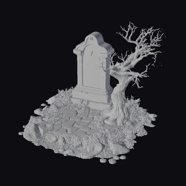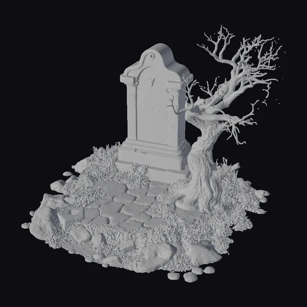 Perched atop a bed of uneven stones and patches of vibrant green grass, an ancient tombstone stands as a testament to forgotten eras. The stone, gray and weathered, bears the scars of time – deep cracks and a surface etched with the relentless passage of seasons. A twisted, leafless tree leans against the tomb, its branches like skeletal fingers reaching towards the sky. The base of the tree and the surrounding stones are blanketed with moss and lichen, adding a verdant hue to the otherwise somber scene. This 3D model, rich in detail and texture, invites you to explore its potential in games, 3D printing, VR/AR experiences, animations, and architectural designs, where atmosphere and storytelling are paramount.