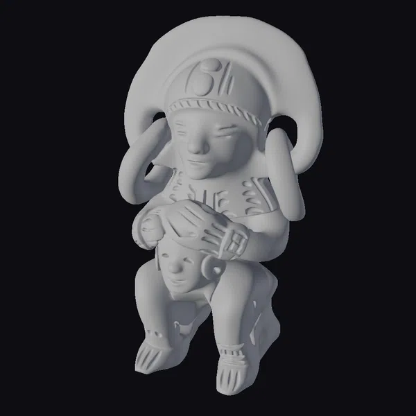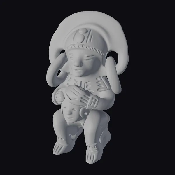 Rendered in exquisite detail, the ancient warrior figurine stands proudly, its ceramic form exuding a sense of history. The figure’s serene expression is juxtaposed with the dynamic pose, as if caught in a moment of contemplative action. The headdress, a sweeping curved design, adds to the statue’s imposing presence, while the smaller figure cradled in the warrior’s arms suggests a story of companionship or protection. The texture of the ceramic material, with its subtle hints of red and tan, brings a tactile quality to the model. Ideal for use in historical reconstructions, animations, or as a unique design element, this model invites exploration and storytelling. Its realistic style ensures a high level of immersion, whether in games, VR/AR experiences, or detailed illustrations.