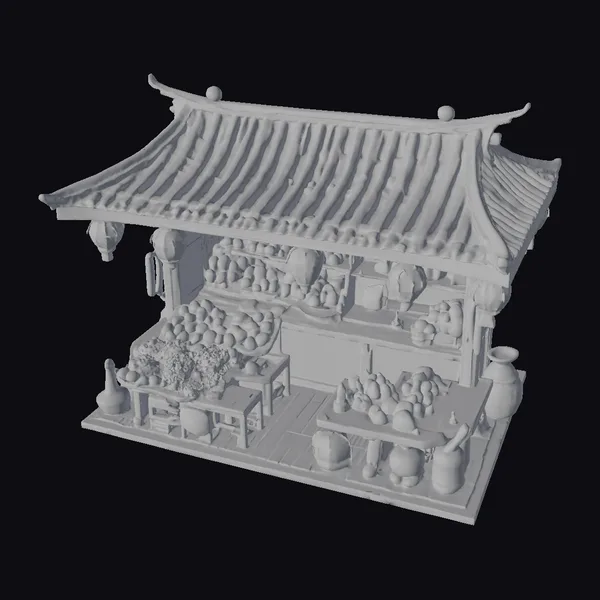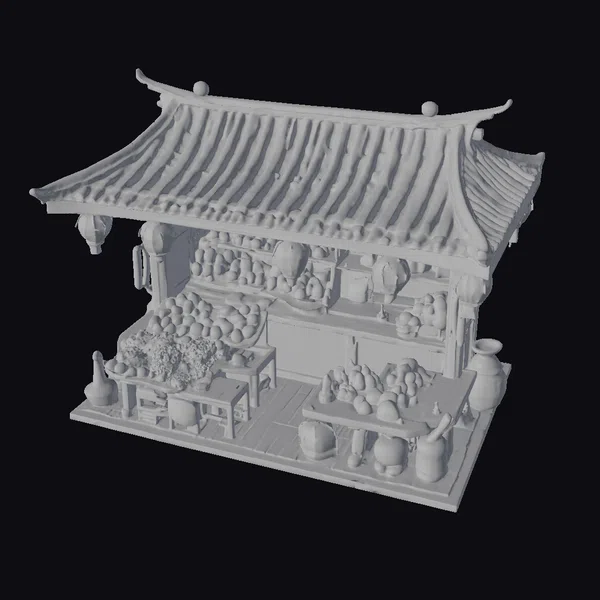 In a stunning display of traditional Chinese architecture, this 3D model presents a quaint fruit stand that seems to leap out of a ancient market. The stand’s roof, with its curved gray tiles, is accentuated by vibrant red and white lanterns that hang from its eaves. The interior of the stand is a kaleidoscope of colors, with various fruits arranged artfully on wooden tables and shelves. The fruits, ranging from oranges and lemons to apples, are meticulously detailed, inviting the viewer to explore every nook. The stand itself is adorned with ceramic vases and pots, enhancing the rustic charm. This model is perfect for projects requiring a touch of traditional Asian ambiance, such as animations, games, or architectural visualizations.