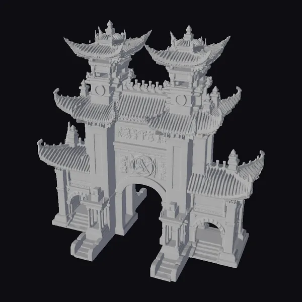 Perched atop a subtle foundation, the gate tower rises with two imposing structures that flank its central archway, each roof a masterclass in curved lines and pointed finials. The body of the gate is adorned with weathered stone and lighter accents, suggesting a blend of durability and aesthetic appeal. Golden characters and motifs stand out against the more subdued tones of the structure, hinting at the rich history and stories embedded within. The model showcases exceptional detail, from the textures that mimic aged stone to the delicate eaves and ornate roof designs. Ideal for projects requiring a touch of ancient elegance, this model can elevate games, 3D print projects, VR/AR experiences, animations, and architectural designs with its unique blend of history and fantasy.