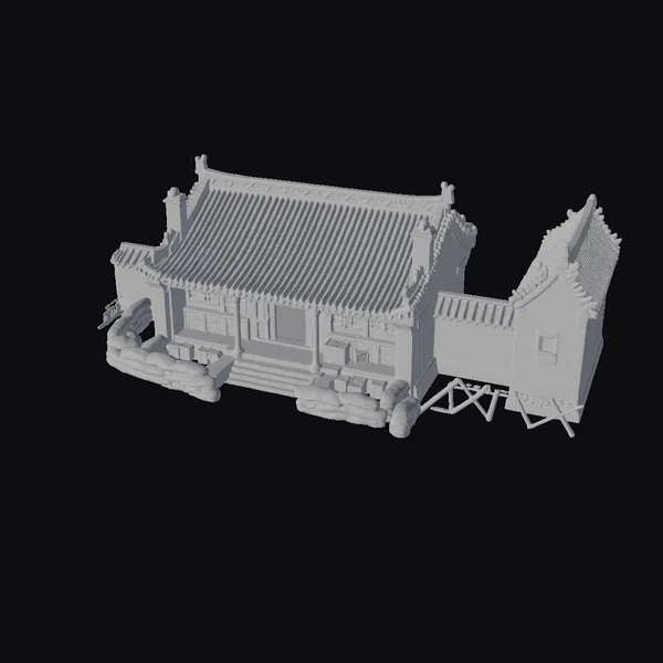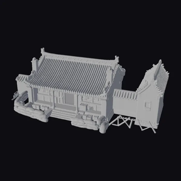 The ancient compound fortress presents itself with a majestic stance, its stone walls bearing a testament to the craftsmanship of a bygone era. The structure’s core is a symphony of grays, from the lighter stone used in the walls to the darker tones of the tiled roof. The roof itself is a marvel of traditional design, with its multiple slopes and overhanging eaves. A set of stairs leads to a covered entrance, flanked by what appears to be makeshift defenses – sandbags stacked high, suggesting a readiness for battle. The building’s design allows for a blend of aesthetic appeal and functional defense. The model is rich in detail, from the texture of the stone and the pattern of the roof tiles to the arrangement of the sandbags. This model would be a valuable asset for projects aiming to recreate historical settings, particularly those set in Asia or inspired by its architectural styles. It could serve various purposes, including game development, architectural visualization, or even educational content, offering a detailed and immersive environment.