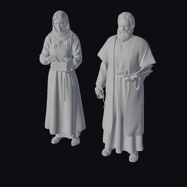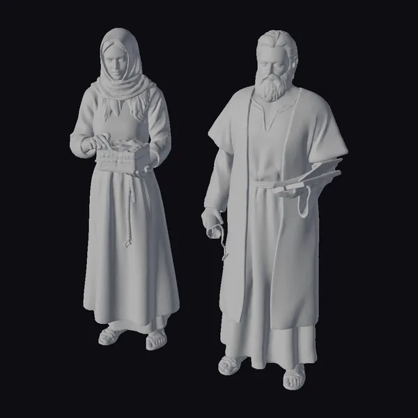 Rendered in exquisite detail, this 3D model of an ancient couple captures a moment of quiet contemplation. The woman, donning a flowing red dress and a white headscarf, carefully holds a golden box adorned with intricate designs. Beside her, the man, distinguished by his gray beard and hair, wears a simple yet elegant brown and beige robe, clutching a wooden tray and a rolled-up scroll. Their downward gazes and the solemnity of their stance evoke a sense of respect and tradition. This model is perfect for projects requiring historical accuracy and emotional depth, such as animations, games, or architectural visualizations set in ancient times.