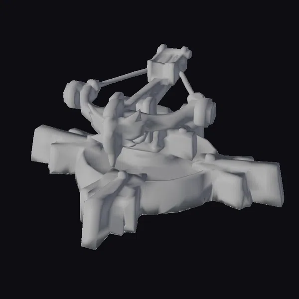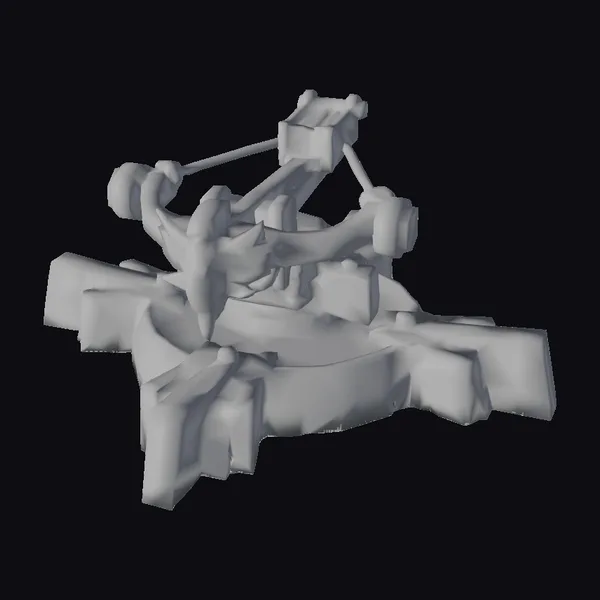 Perched atop a rugged blue-gray base, the Ancient Crossbow Fortress presents a formidable sight. The device features a complex interplay of gold, silver, and dark gray metallic parts, with red rods adding a pop of color. The crossbow itself is a work of art, with a blend of curved and angular shapes that evoke both ancient craftsmanship and futuristic technology. The model’s base is adorned with protruding blue-gray stone-like structures, adding to its fortress-like appearance. Ideal for use in games, 3D printing, VR/AR experiences, animation, and design projects, this model brings a touch of fantasy and industrial sci-fi to any project.