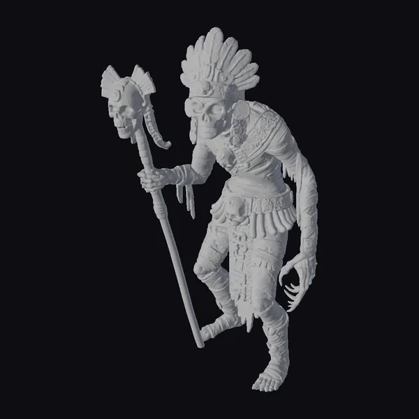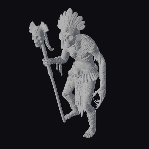 Shrouded in an aura of ancient mystique, this stylized Aztec mummy embodies the fearsome essence of a long-forgotten death god. Adorned in intricate, weathered armor and a feathered headdress, it grasps a staff topped with a skull, exuding an otherworldly power. The neutral background accentuates the model’s eerie, golden hue, inviting you to delve into the mysteries of a bygone era.