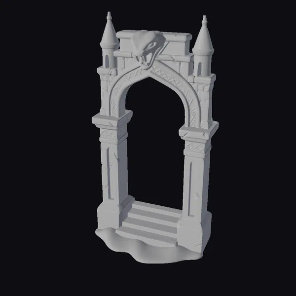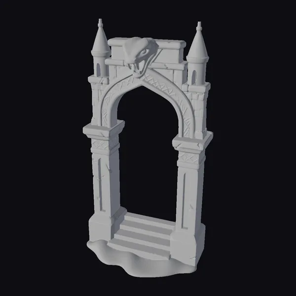 The Ancient Desert Archway stands tall, its stone construction weathered to a warm, golden hue that suggests centuries of desert sun exposure. The arch itself is flanked by two imposing towers, each topped with a slender, pointed turret that adds a touch of gothic elegance to the overall design. A sculpted snake head protrudes from the top center, its mouth open in a fierce snarl, adding a hint of danger and mysticism. The structure rests on a stepped base, with a small pool of sand accumulating at its feet, suggesting it has stood here for ages, silently witnessing the passage of time. The walls of the archway are adorned with intricate patterns and green accents, hinting at a rich history and cultural significance. This model is perfect for use in games, 3D printing, VR/AR experiences, animation projects, and architectural designs looking for a touch of ancient mystique.