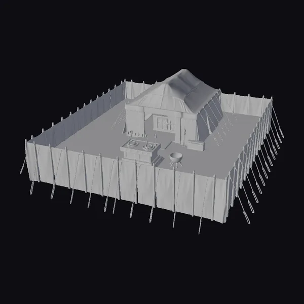 Gaze upon the majestic ancient desert tabernacle, meticulously recreated in 3D. The model showcases a beige tent-style roof, elegantly complemented by blue walls adorned with gold accents. The interior features a range of furniture pieces, including a table with offerings, a bench, and a bowl, all carefully positioned to evoke a sense of historical authenticity. The tabernacle is surrounded by a sturdy fence, complete with wooden posts and white fabric panels. This model is perfect for use in historical, religious, or educational projects, and can be easily integrated into 3D environments for games, animations, or architectural visualizations.