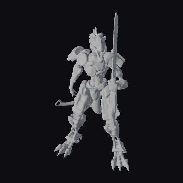Standing proudly, this colossal automaton showcases a mesmerizing blend of prehistoric and medieval features. Its body, reminiscent of a bygone era, is crafted from what appears to be ancient dinosaur bones, reinforced with sleek, futuristic alloys. The head, a striking dinosaur skull, gazes forward with a fierce expression, while its mechanical limbs are poised for battle, one hand gripping a long, sharp sword. The texture of the model combines the organic with the industrial, featuring metallic surfaces with visible bolts, wires, and a predominantly beige and dark color scheme that suggests age and resilience. The pose, dynamic and powerful, captures the essence of a creature ready to charge into battle. This model is perfect for projects requiring a unique blend of history and science fiction, such as game environments, animated films, or architectural designs that seek to push the boundaries of imagination.