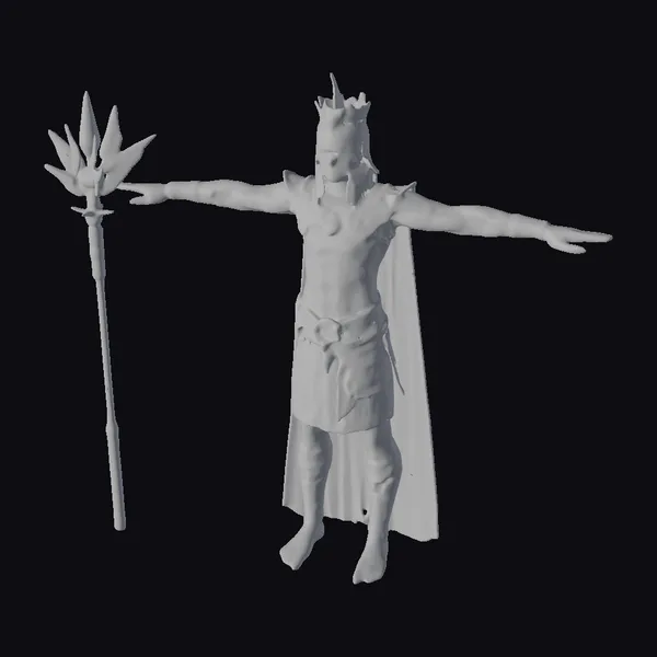 Standing tall with arms outstretched, this 3D model of an ancient Egyptian pharaoh exudes an aura of divine authority. The model’s pose showcases the intricate details of the costume, including the textured, metallic sheen of the staff and the delicate patterns on the headdress. The pharaoh’s bare torso and legs are toned and muscular, adding to the overall sense of strength and majesty. The rainbow-colored cape flows dramatically behind, adding a pop of color to the otherwise earthy tones of the outfit. This model is perfect for use in games, animations, or 3D prints where a touch of ancient mystique is required. The level of detail and realism makes it suitable for close-up shots or dramatic scenes.