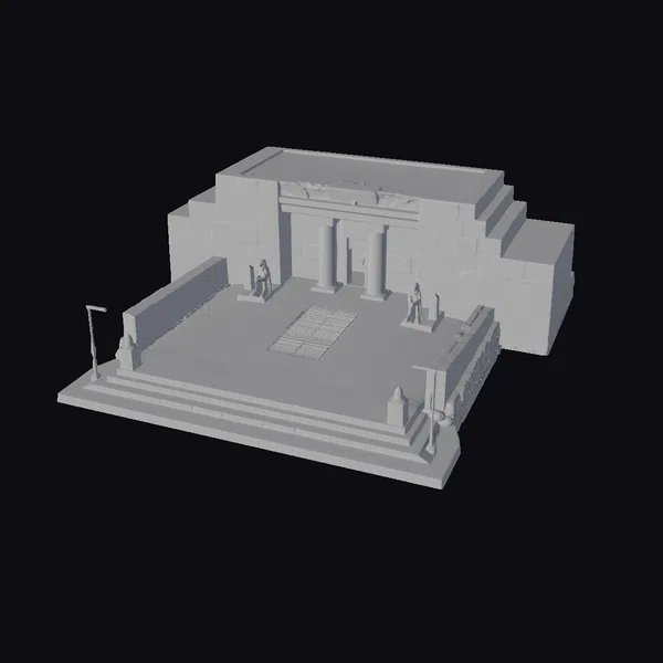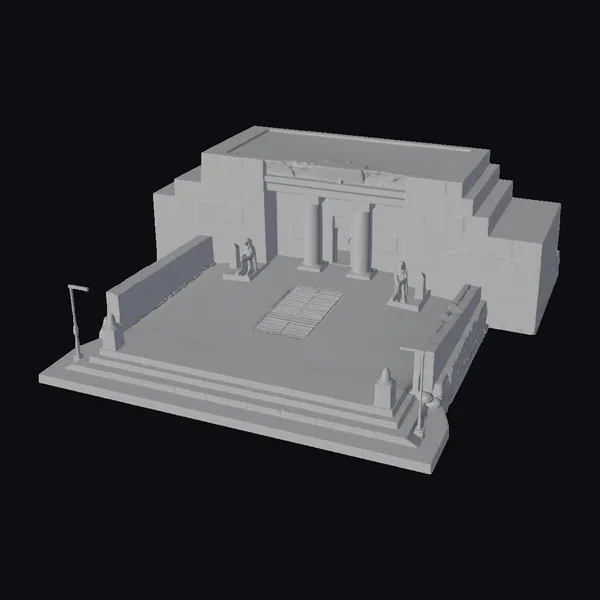 Crafted with precision, this 3D model of an ancient Egyptian temple entrance boasts a robust stone structure with a series of imposing columns that line the front, leading to a grand doorway. The intricate carvings on the stones and the detailed texture of the sandstone blocks bring an air of authenticity to this ancient wonder. The model includes several statues and a large stone slab, adding to the historical ambiance. Ideal for use in games, architectural visualizations, historical documentaries, or virtual reality experiences, this model is designed to create an immersive ancient Egyptian environment.