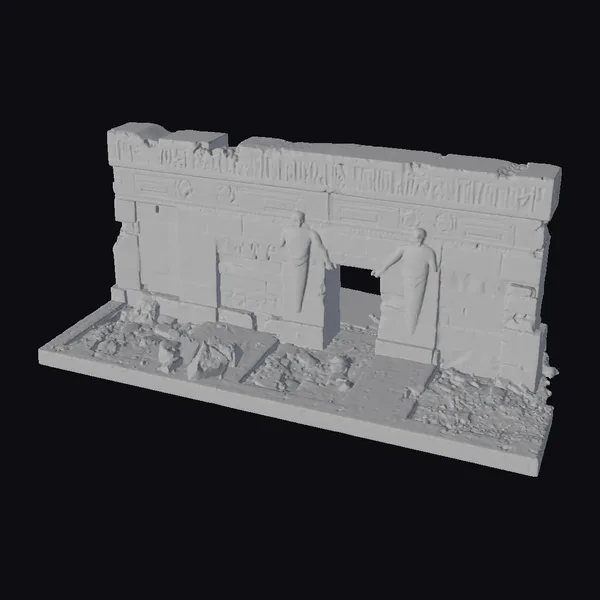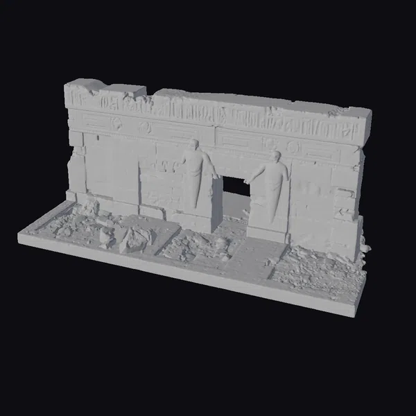 Gaze upon the detailed facade of this ancient Egyptian temple entrance, where the warm, golden hues of sandstone evoke the desert landscapes that have cradled such structures for millennia. The model’s surface is rich with texture, from the finely etched hieroglyphics that dance across the lintel and walls, to the rough, weathered stones that form the base of the structure. Two statues, their bodies rendered in smooth, flowing lines, stand guard at the entrance, their simple wrappings a testament to the austere beauty of ancient Egyptian art. The base of the model is strewn with rubble and sand, adding to the sense of age and abandonment. This model is perfect for use in historical reconstructions, games, animations, or as a standalone piece for 3D printing, offering a blend of educational value and aesthetic appeal.