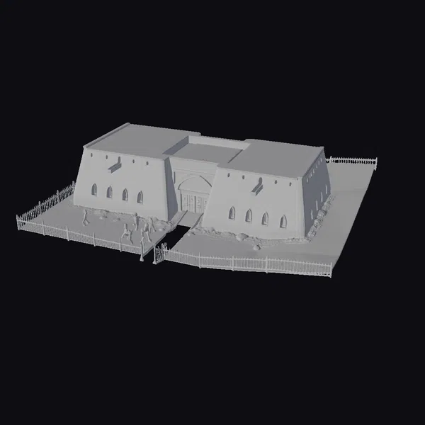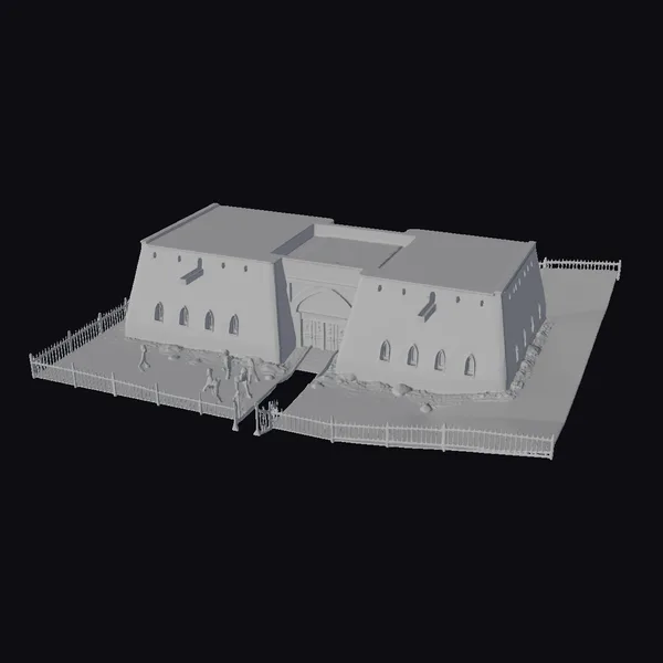 The ancient fort structure is meticulously detailed, with a focus on its imposing architecture and the textures that tell a story of age and exposure. The model showcases a central building with a large archway, flanked by two smaller wings, each adorned with several arched windows. The roof is a mix of flat and sloping sections, suggesting a blend of functionality and aesthetic appeal. The fort sits on a bed of stones and grass, with a black metal fence that adds a layer of security and delineation. The lighting highlights the textures of the stone and metal, bringing out the ruggedness and the history embedded in the structure. Ideal for use in historical reconstructions, games, or architectural visualizations, this model offers a rich visual and narrative potential.