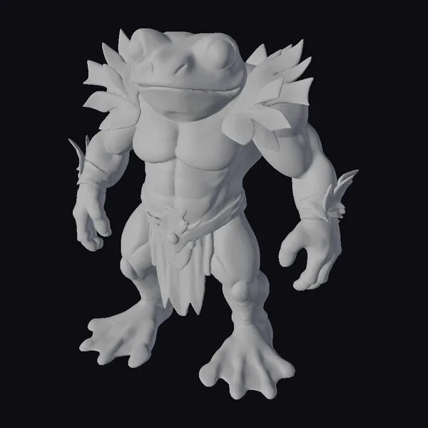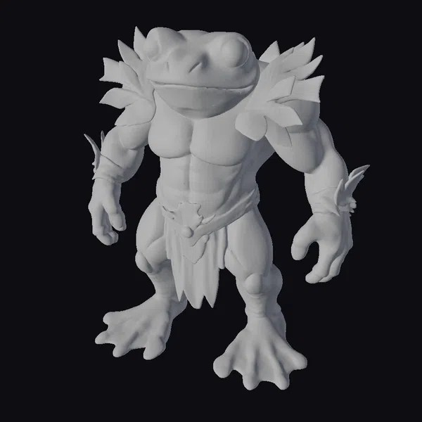 Standing proudly with its muscular physique, this ancient frog guardian boasts intricate details such as textured green skin, bright orange webbed feet, and vibrant red eyes that seem to glow with an inner light. The addition of leafy appendages around its neck and arms adds a touch of mystique, suggesting a deep connection to nature. A rustic loincloth made of what appears to be tree bark cinches at its waist, completing its primal yet powerful look. This model is perfect for projects that require a mythical, heroic creature, such as animations, games, or fantasy-themed designs. Its unique blend of fantasy and realism makes it a versatile asset for any creative endeavor.