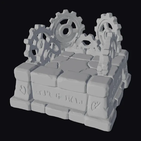 Perched atop a weathered stone base, a complex gear mechanism seems poised to activate at any moment. The gears, a mix of rusty brown and metallic grey, are interspersed with green moss and cracks in the stone, suggesting age and neglect. Glowing blue runes on the pedestal’s side pulse softly, adding an air of mysticism. This 3D model captures the essence of an ancient, mystical chamber, perfect for projects requiring a blend of technology and fantasy. Ideal for use in games, animations, or architectural designs seeking a unique, otherworldly element.