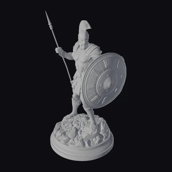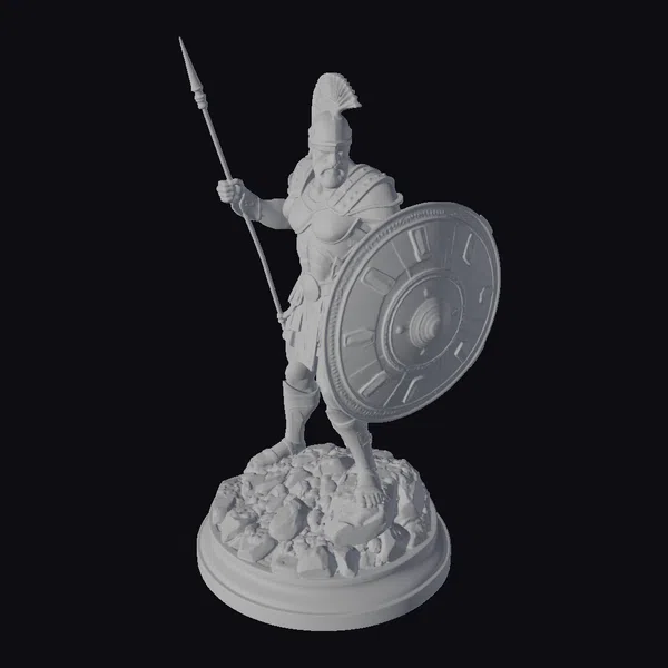 This meticulously crafted 3D model presents a detailed ancient Greek hoplite warrior, poised on a rugged base that simulates rocky terrain. The warrior’s golden armor, complete with a helmet featuring a crest, shines with a sense of grandeur. His left hand grips a long spear, while his right shields him with a large, ornate aspis adorned with colorful accents. The model’s facial features are chiseled, with a focused expression. The quality of the model is evident in the intricate textures and the balanced pose, suggesting dynamic movement. Ideal for use in historical animations, games, or as a detailed architectural reference for ancient Greek settings.