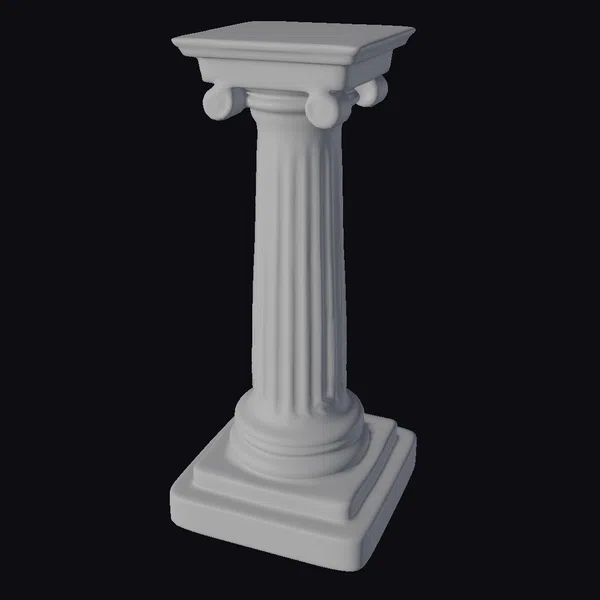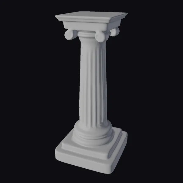 Positioned majestically, the column’s fluted shaft rises from a square base, adorned with a simple yet elegant capital that supports a flat square abacus. The surface showcases a meticulously crafted stone texture, complete with subtle weathering that adds character. The four scroll-like volutes on the capital are finely detailed, contributing to the overall classical ambiance. This pedestal model is versatile, suitable for various applications including game environments, architectural visualizations, 3D printing, and film productions where an element of historical authenticity is desired.