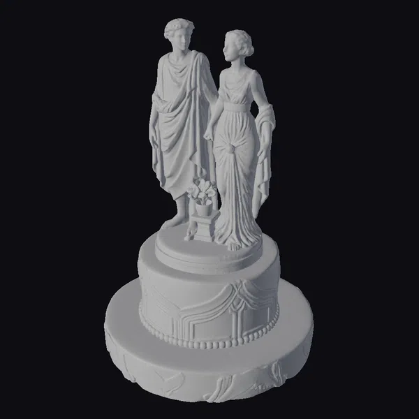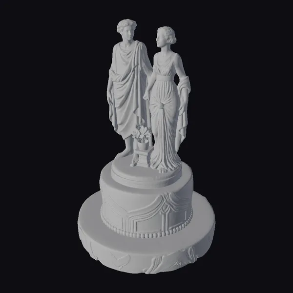 Positioned in a contemplative stance, the man and woman are sculpted with precision, their facial expressions and body language conveying a deep sense of connection. The man, draped in a classic toga, stands beside the woman, who wears an elegant gown that drapes beautifully around her form. A small decorative element rests at their feet, adding to the narrative depth of the piece. The base, adorned with architectural details, enhances the statue’s grandeur. This model is perfect for projects requiring a touch of ancient Greek sophistication, suitable for use in games, 3D printing, VR/AR experiences, animations, and architectural visualizations.