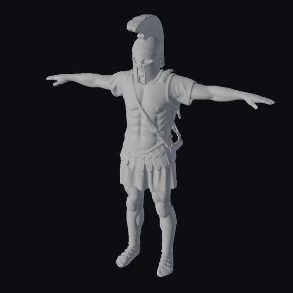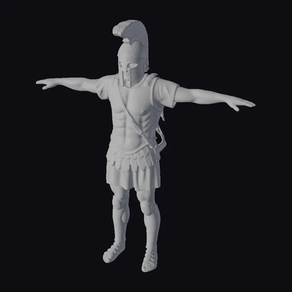 In a powerful stance, this 3D model of an ancient Greek hoplite presents a commanding presence, arms outstretched and legs shoulder-width apart. The warrior’s bronze armor, adorned with a distinctive red plume on its helmet, gleams with a subtle metallic texture, reflecting light on its chest plate, greaves, and belt. The short red tunic and pleated skirt add a pop of vibrant color, while the sandals and leather straps bring a sense of authenticity to the overall design. The model’s pose highlights its detailed anatomy, from the muscles beneath the skin to the carefully crafted facial features. Ideal for historical reenactments, educational projects, or cinematic productions, this 3D model brings ancient Greece to life with stunning accuracy.