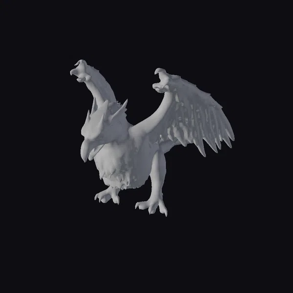 Positioned in a dynamic stance, the griffin’s body is angled to the left, showcasing its impressive wingspan and muscular build. The feathers are meticulously detailed, with varying textures that suggest both softness and strength. The head, with its sharp beak and piercing gaze, turns towards the viewer with an air of vigilance. The stone-like texture, complete with subtle weathering and shadowing, gives the model a realistic and aged appearance. Ideal for use in games, animations, or architectural designs where a touch of fantasy and history is desired.