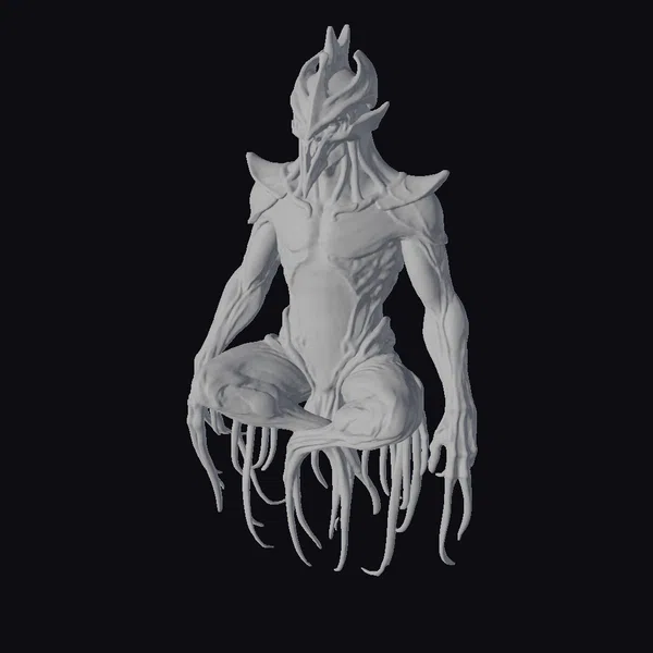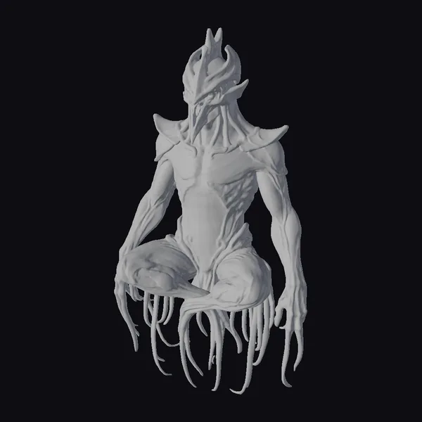 Detailed in every aspect, this ancient guardian creature model showcases an intricate design that captures the imagination. The creature sits in a meditative pose, with its body adorned in a texture that mimics organic, almost decaying flesh, yet it radiates a strange, otherworldly vitality. The head, a fusion of dragonfly and reptilian features, boasts glowing red eyes that seem to hold ancient wisdom and a hint of malevolence. Long, slender tentacles flow from its lower body, adding to its mystique and terror-inspiring presence. This model is perfect for projects requiring a creature that embodies both the fantastical and the grotesque, suitable for games, animation, VR/AR experiences, and design projects that venture into the realm of the unknown.