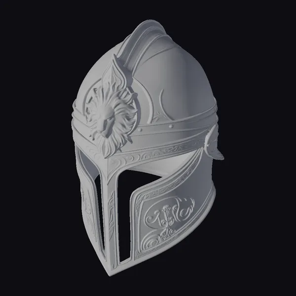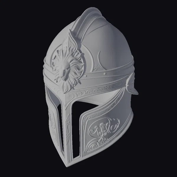 The Ancient Guardian Helmet boasts a richly detailed design, with a dark gray base that contrasts beautifully with its golden accents. The helmet’s surface is etched with ornate patterns, adding depth and a sense of history. A striking golden emblem on the forehead adds a heroic flair. Positioned at a slight angle, the helmet showcases its profile, highlighting the protective yet elegant design of its cheek and neck guards. Ideal for use in games, animations, or 3D printing, this model brings a piece of legendary armor to your fingertips.