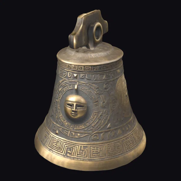Crafted with meticulous attention to detail, this bronze bell showcases a stunning array of geometric Inca patterns and celestial symbols, meticulously engraved into its surface. The weathered finish adds a layer of depth and history to the piece, inviting the viewer to ponder its origins. The bell’s shape is classic, with a sturdy base and a elegantly curved body, topped with a stylized handle. The central motif features a serene face, adding an air of mystique. This model is perfect for use in games, 3D printing, VR/AR experiences, animation, and design projects, where a touch of ancient mysticism is desired.