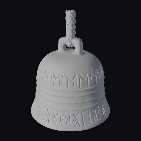 Positioned centrally, the bell’s rounded form tapers slightly towards the top, where a sturdy rope handle beckons. The surface is a tapestry of runic etchings, swirling around the bell’s body in a dance of ancient lore. Two bold stripes, one crimson and one emerald green, encircle the bell, adding a pop of color to its otherwise earthy tones. As light catches the bell, the runes seem to shimmer, imbuing the object with an otherworldly aura. Ideal for those who weave tales of fantasy or craft worlds rich in lore, this bell can become a pivotal prop in games, animations, or virtual reality experiences, transporting viewers to realms both mystical and forgotten.