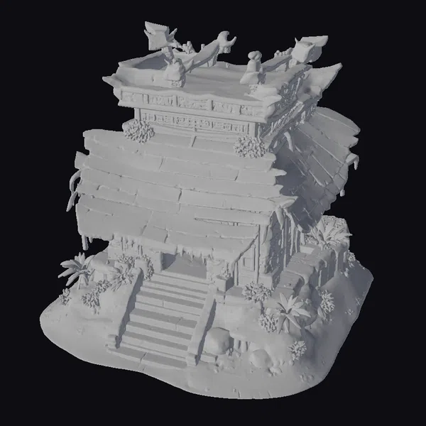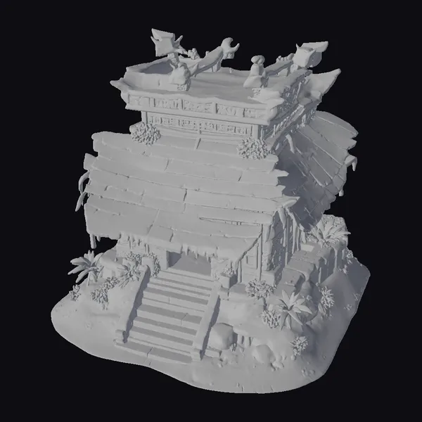 Perched atop a raised platform, the temple’s entrance beckons with a worn stone staircase, flanked by lush greenery and mysterious stone statues. The walls, adorned with intricate carvings, rise towards the sky, their weathered surfaces bearing the scars of time and the relentless jungle environment. The roof, a maze of interlocking stone tiles, appears precarious, as if it might collapse at any moment. As the jungle reclaims this ancient structure, the atmosphere grows thick with anticipation – will you dare to venture inside and uncover the secrets hidden within? This 3D model is perfect for games, animation, or architectural visualization projects seeking to transport viewers to a mystical, long-abandoned world.