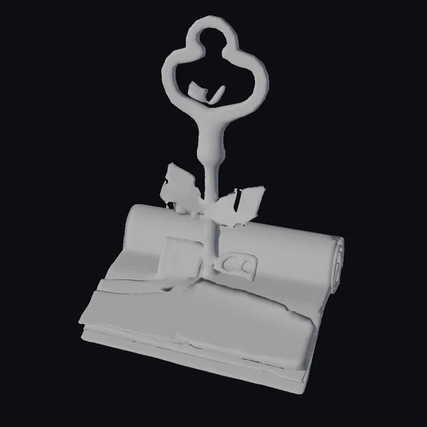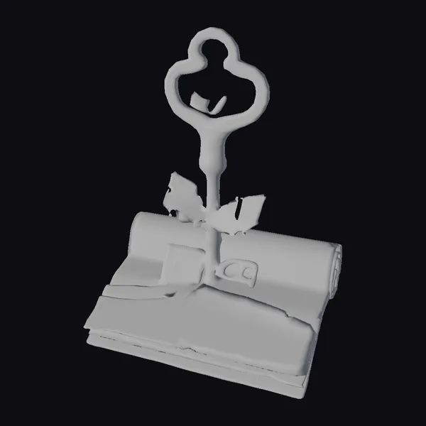 In a stunning display of intricate design, this 3D model features an ancient key standing proudly on a worn scroll, as if guarding the secrets within. The key’s ornate details and golden color are meticulously rendered, with a subtle patina suggesting age and wisdom. A few green leaves emerge from the key’s center, intertwining with its structure and symbolizing the harmony between nature and human creation. The scroll beneath, with its rolled-up pages, appears aged and yellowed, adding to the overall sense of antiquity and mystique. This model is perfect for use in games, animations, or 3D printing projects where a touch of ancient wisdom and symbolism is desired.