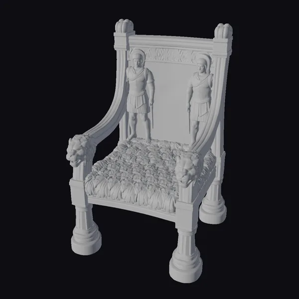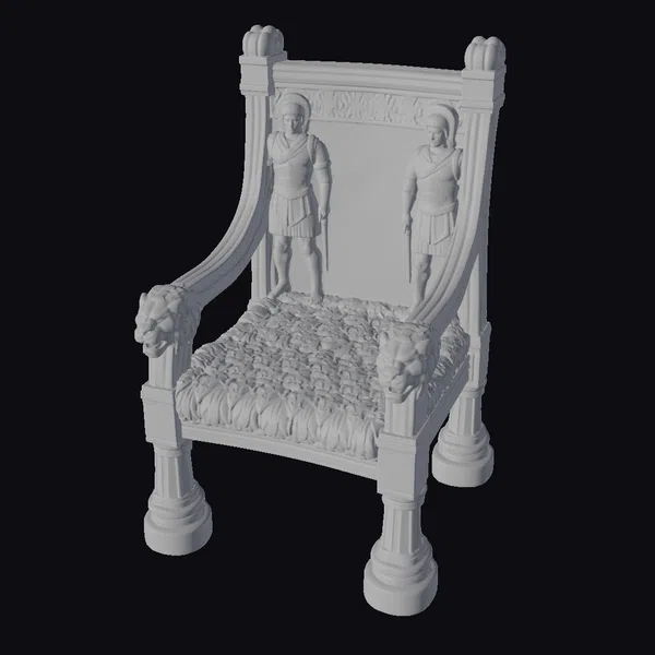 Crafted with meticulous attention to detail, this ornate chair boasts a sturdy frame adorned with lion’s heads at the armrests and a richly patterned seat. The backrest features two imposing guards carved in a heroic stance, their armor and helmets a marvel of ancient craftsmanship. The throne’s golden color, with subtle variations in tone, suggests a well-aged patina, adding to its allure. The intricate carvings and robust design make it a centerpiece for any setting, from historical reconstructions to fantasy environments. Ideal for use in games, 3D printing, VR/AR experiences, animation, and design projects.