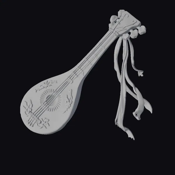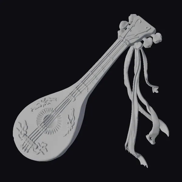 The Ancient Lute Instrument is meticulously crafted with a teardrop-shaped body, featuring an ornate sunburst design within its sound hole. The neck of the lute is embellished with a decorative element resembling a floral motif, complete with ribbons flowing from it, giving the instrument a sense of dynamic movement. The model showcases a golden color with a subtle texture, suggesting a weathered yet precious metal finish. The lute’s body is decorated with floral patterns that add to its ancient, mystical aura. With its detailed design and stylized appearance, this model is ideal for use in games, animations, and virtual reality experiences, particularly those with a historical, fantasy, or cultural theme.