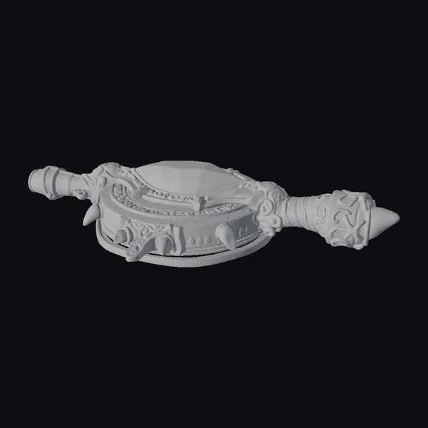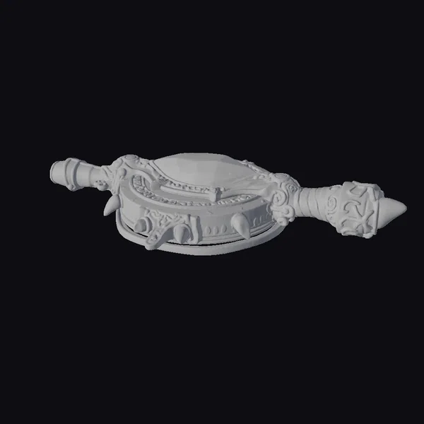 Crafted with meticulous attention to detail, this ancient magical artifact boasts a richly textured surface, with a predominantly dark metallic hue accented by warm golden tones. The object’s central feature is a rounded, orange-tinted panel, flanked by ornate handles that appear to be made from a combination of dark metal and golden alloys. The handles’ ends are shaped like a bulbous form and a sharp, pointed tip, respectively, adding to the artifact’s enigmatic presence. As a 3D model, it offers endless possibilities for use in various projects, including games, animations, and virtual reality experiences, allowing creators to weave their own tales of magic and adventure around this captivating relic.