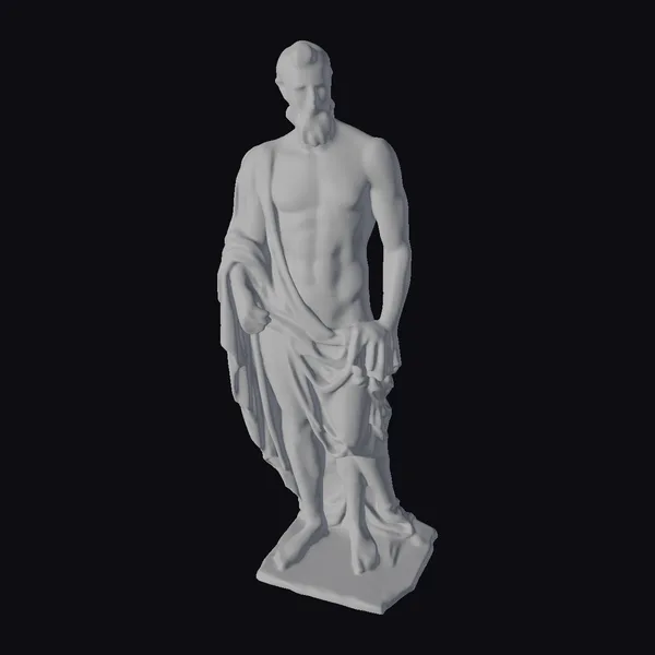 Standing tall with a commanding presence, this realistic 3D model captures the essence of an ancient Greek man. His body, defined by pronounced muscles, is partially covered by a meticulously draped toga, showcasing the fabric’s folds and textures with stunning accuracy. The figure’s facial features are equally impressive, with a strong jawline and a thick beard that adds to his authoritative demeanor. Positioned on a simple base, this model is perfect for projects requiring a historical or mythological touch, such as animations, games, or architectural visualizations. Its high level of detail, from the texture of the skin to the drapery of the toga, ensures a versatile application across various creative fields.
