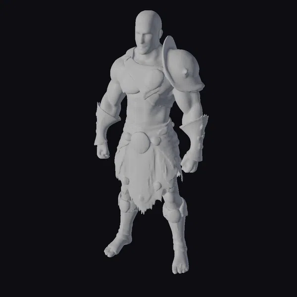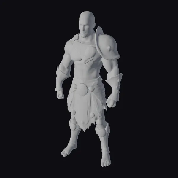 Standing tall with a powerful stance, this ancient male warrior model showcases a detailed physique, emphasizing strength and combat readiness. His short, dark hair and focused gaze contribute to an aura of determination. The armor, a combination of dark leather and shiny gold, covers key areas while leaving his muscular torso exposed. The gold accents on the armor catch the light, suggesting a high status or wealth. This model is meticulously crafted, with attention to the textures of the leather, the shine of the gold, and the muscular definition of the warrior. The bare feet and the ripped sections of the armor add a layer of realism and story to the character, suggesting battles fought and won. Ideal for projects requiring a strong, historical, or fantasy character, such as games, animations, or architectural visualizations.