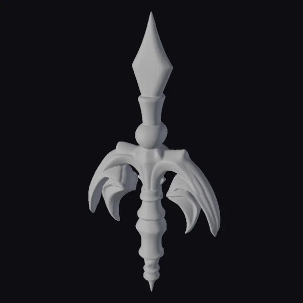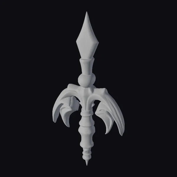 Perched atop a slender, ornate shaft, the spearhead of the Ancient Metal Emblem stretches towards the sky like a foreboding dagger. The metal’s dark, weathered finish suggests age and battle-hardened resilience. Its central shaft is adorned with bulbous, ornamental segments that lead to the fearsome, curved blades, reminiscent of claws or talons, which jut out from the middle. The spearhead itself tapers to a sharp, faceted point, exuding an aura of lethal precision. This emblem would be a striking addition to any dark fantasy setting, suitable for use in games, 3D printing, VR/AR experiences, or as a design element in animation and visual effects projects.