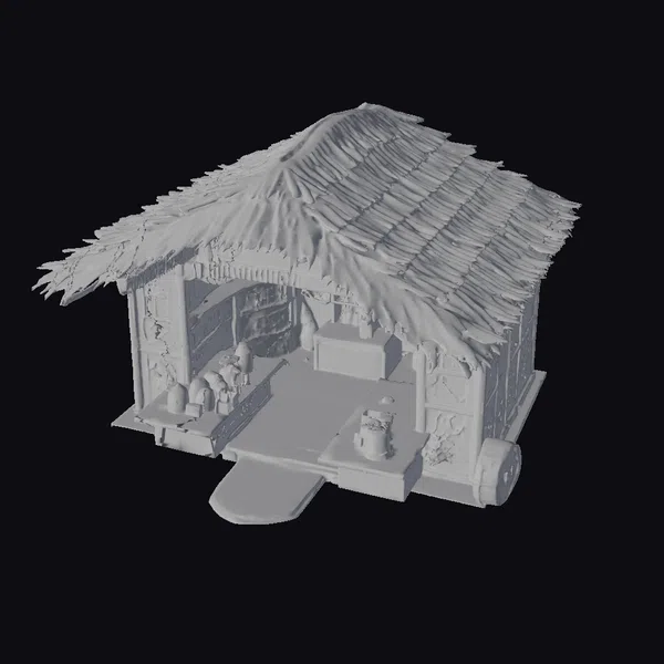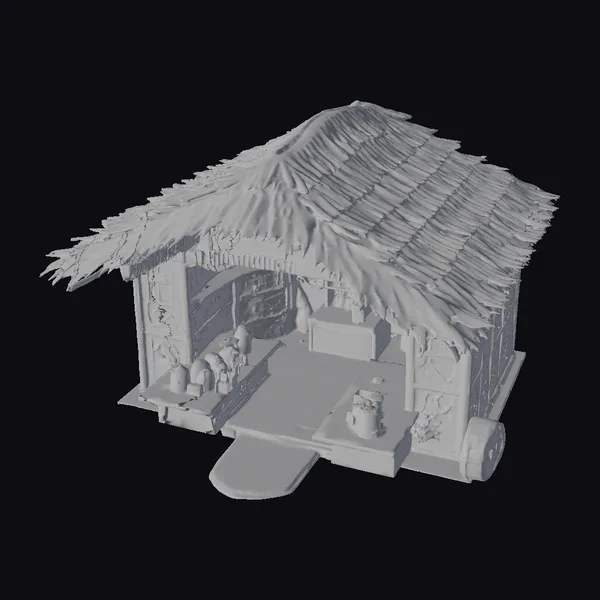 Perched on a worn wooden platform, this ancient metal medicine hut boasts a weathered thatched roof with a mesmerizing blue glow seeping from the top. The rustic exterior gives way to a dimly lit interior, where wooden shelves and countertops display an assortment of glowing blue jars and mysterious artifacts. Soft, warm lighting spills from lanterns on either side of the entrance, beckoning you to explore the secrets within. This ultra-realistic 3D model is perfect for games, animation, VR/AR experiences, and design projects seeking a touch of mystique and wonder.