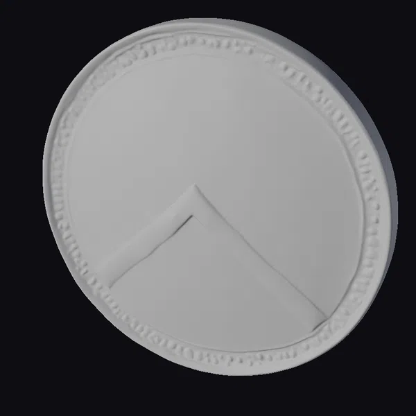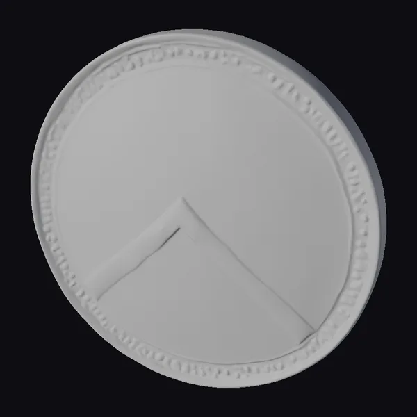 In a pose that commands attention, the ancient metal shield emblem showcases a richly detailed design. The shield’s circular form is adorned with a raised border of small dots, adding a layer of texture to its already imposing presence. At its center, a triangular shape is embossed, pointing upwards, suggesting a symbol of protection or unity. The metallic surface exhibits a warm, golden color with subtle variations in tone, hinting at a history of use and reverence. The shield’s ornate details and robust construction evoke a sense of ancient craftsmanship. Ideal for use in historical reenactments, graphic design projects, or as a unique element in architectural visualizations, this model brings a touch of antiquity and strength to any creative endeavor.