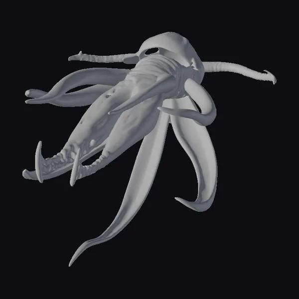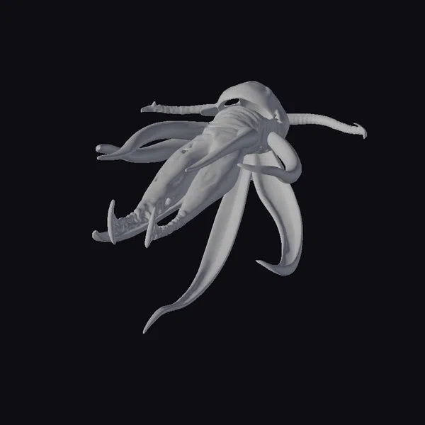 In a hauntingly beautiful pose, the ancient sea creature emerges from the depths, its long, curved tentacles stretching out like ghostly fingers. The metallic surface glistens with a subtle sheen, accentuating the creature’s otherworldly appearance. The texture of its body appears almost scaly, with hints of ancient, weathered stone. As the creature moves through the darkness, its gothic-inspired design seems to shift and writhe like a living shadow. Perfect for use in games, 3D printing, VR/AR experiences, animation, and design projects, this model is sure to add a touch of the unknown to any project.