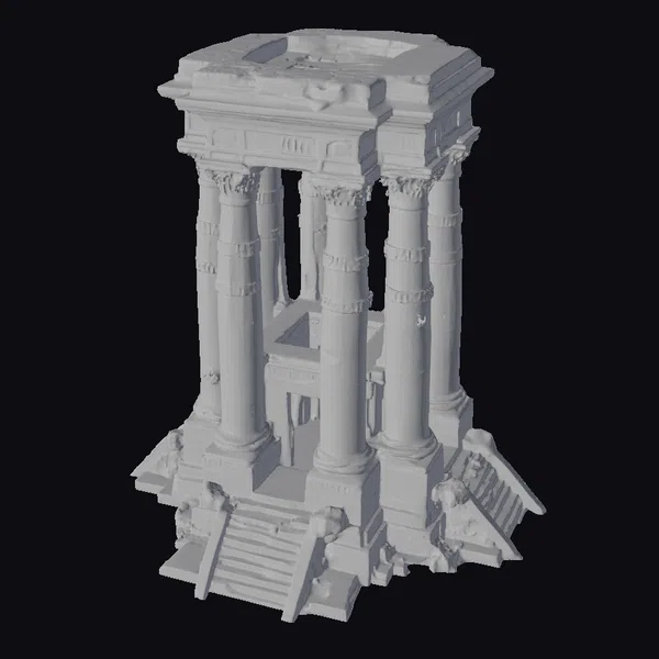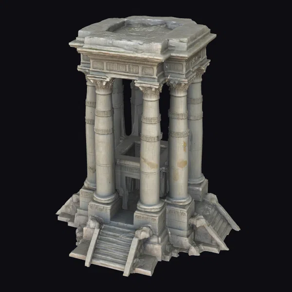 Perched atop a base that seems to have been claimed by the earth, this monolithic temple rises with imposing presence. Eight sturdy columns support its square structure, each one uniquely textured to reflect the relentless passage of time. The stone appears worn, with discoloration and weathering that adds to its ancient charm. A square opening at the top and a central void within the columns suggest a design both functional and symbolic. The steps at the front, flanked by stone protrusions, beckon viewers to explore the secrets within. This model is perfect for projects requiring a touch of ancient mystique, suitable for use in games, 3D printing, VR/AR experiences, animations, and architectural designs.