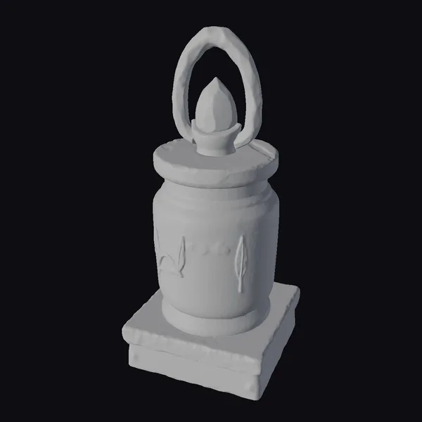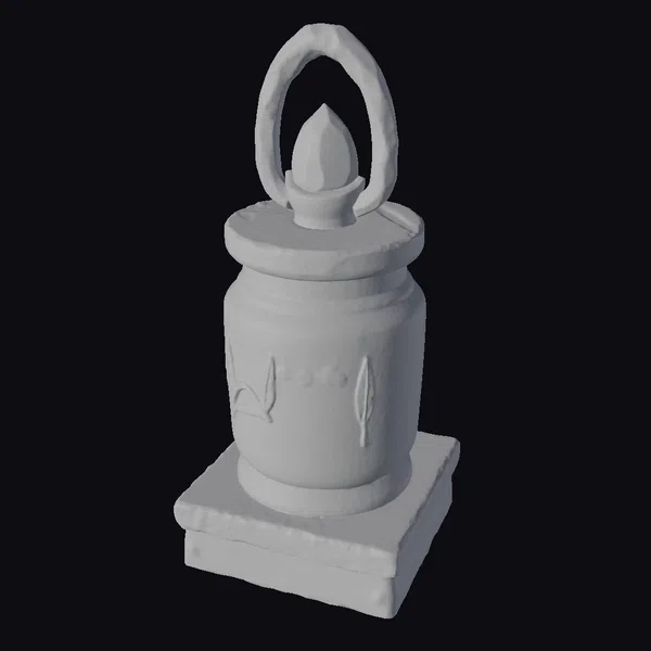 Perched atop a weathered square base, a mysterious stone obelisk rises, adorned with intricate leaf patterns and crowned with a crystal nestled in a rope-like handle. The obelisk’s surface whispers tales of ancient civilizations, its gray and beige tones evoking a sense of mystique.